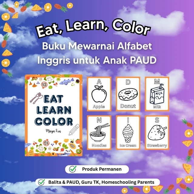 Kenalkan huruf A sampai Z dalam bahasa Inggris kepada si kecil dengan cara yang menyenangkan. Setiap halaman berisi satu huruf besar, nama makanan dalam bahasa Inggris, dan gambar lucu yang siap diwarnai.